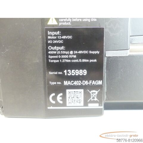 JVL MAC402-D6-FAGM Low Volt Integrated Servo Motor SN:135989 - ! -