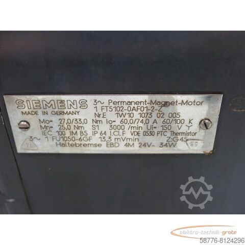 Двигатель с постоянными магнитами Siemens 1FT5102-0AF01-2-Z, Z= см. заводскую табличку, серийный номер: E1W10107302005