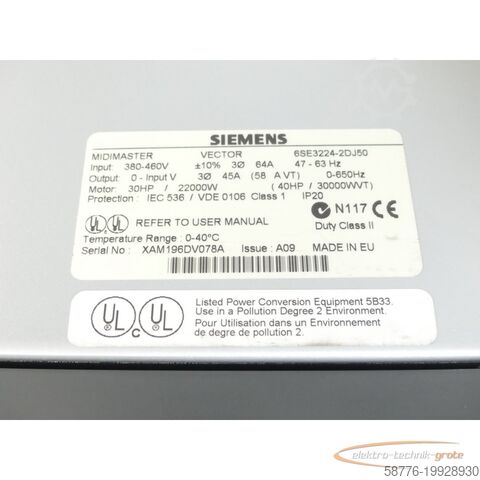 Компонент Siemens Siemens 6SE3224-2DJ50 MIDIMASTER VECTOR Version: A09 SN:XAM196DV078A