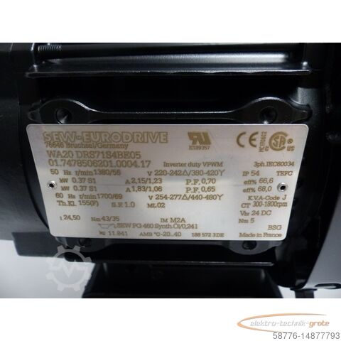 SEW WA20 DRS71SS4BE05 / 01.7478506201.0004.17 Редукторный двигатель серийный номер: MK117811 со второй заводской табличкой, неиспользованный, 100% работоспособен, комплект поставки согласно фотографиям