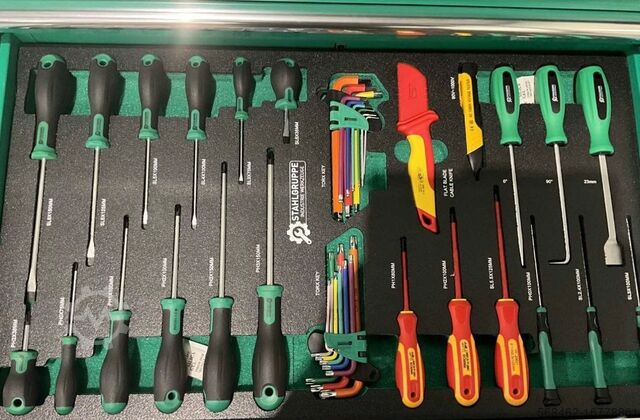 4 поворотных ролика, набор трещоток и торцевых головок до размера 350 386, инструменты из хром-ванадия, набор гаечных ключей из 29 предметов (60 мм-50 мм), 3 набора трещоточных ключей с торцевыми головками и битами, набор кольцевых ключей из 11 предметов, разводной ключ из 12 предметов, набор плоскогубцев, 2 молотка и 4 резака, набор остроконечных пил и зубил, 12 отверток, шестигранники, гаечные ключи Trox, прецизионные инструменты, набор Т-образных ключей из 21 предмета, набор ударных торцевых головок из 34 предметов + торцевые головки Trox и шестигранники, ключ с трещоткой, светодиодный фонарь, пила, ножницы, нож, измерительные инструменты и многое другое.