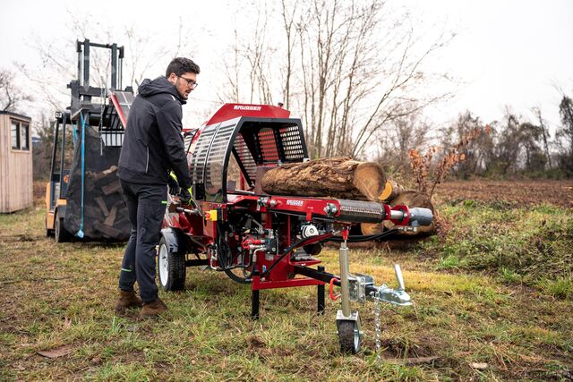 Несмотря на большое усилие раскалывания и большой диаметр, автоматическая дровоколка остается относительно компактной. Оснащенный дышлом, он может быть прикреплен к любому прицепу и таким образом легко транспортируется.