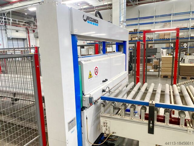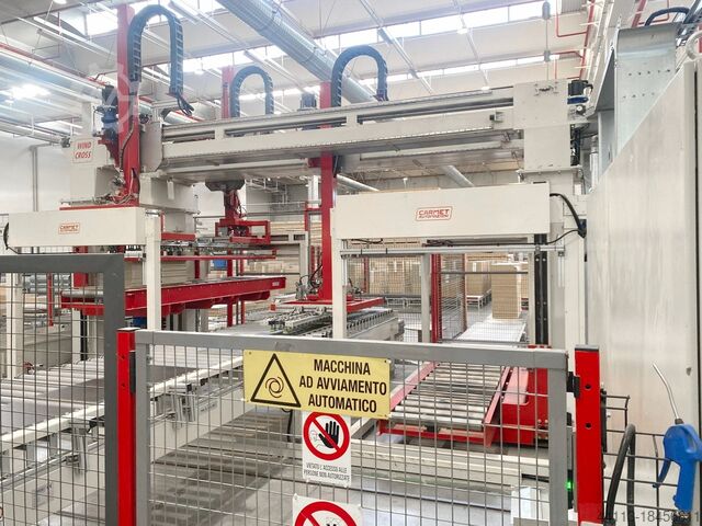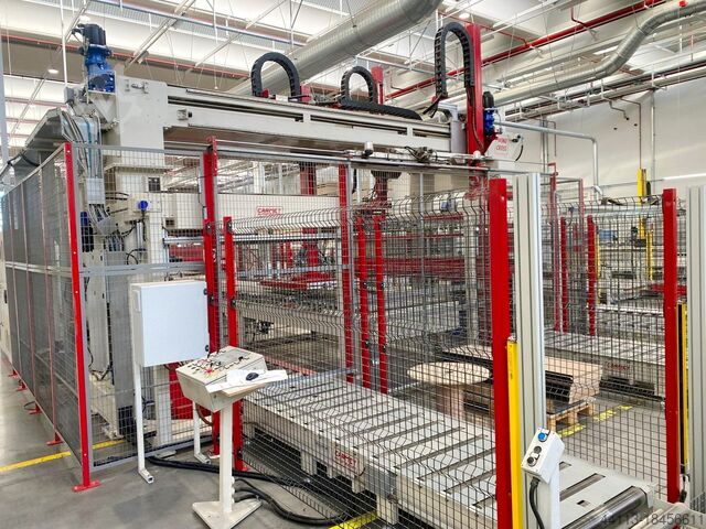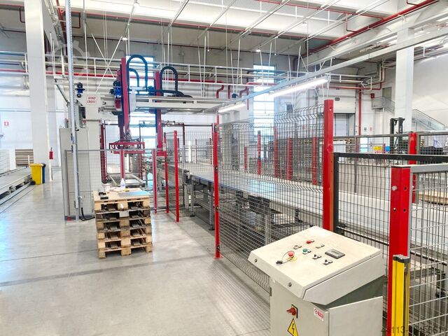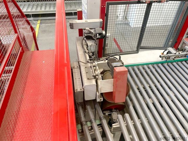 With central motorised roller conveyor and 2 motorised ground roller ways to take the panels (stacks) from the unloader
