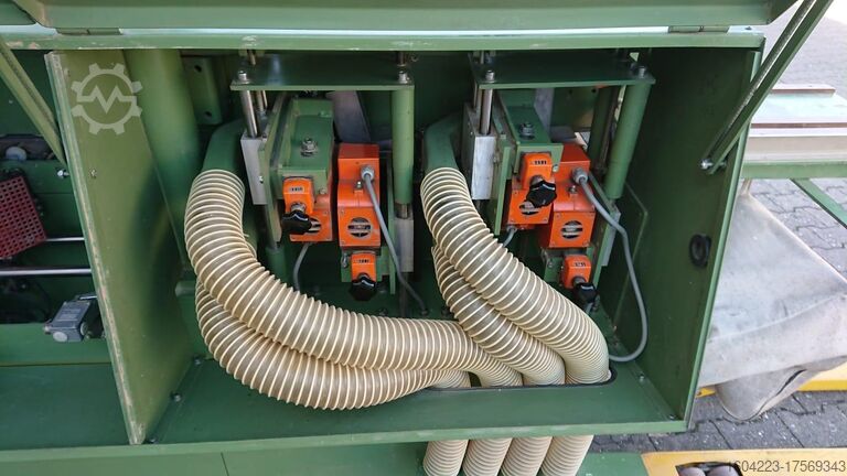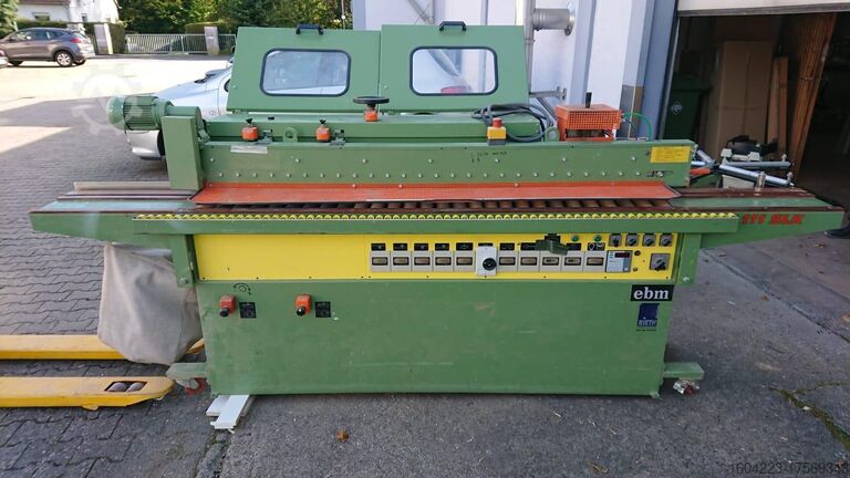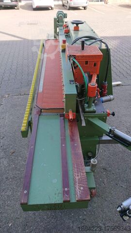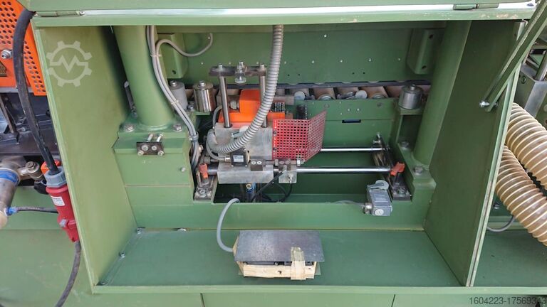 мобильный, двигатель 11,5 кВт, склеивание от 0,5 до 5 мм, регулируемый откидной нож, бассейн быстрого нагрева, блок поперечных пил HF, блок обрезки заподлицо HF, блок обрезки фасок и радиусов HF, выдвижная роликовая опора заготовки, центральный отсос, шасси, длина ок. 3 350 мм x глубина 950 мм,