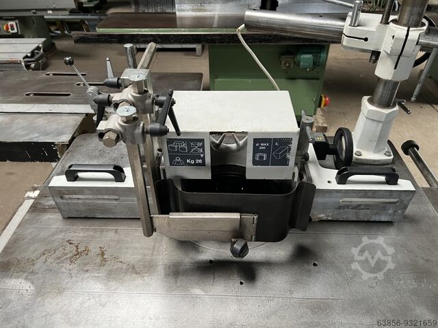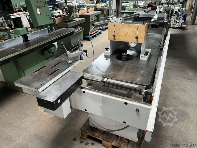 Фрезерно-отрезной станок, оснащенный кареткой для шипования, удлинителем рабочего стола и опорной планкой