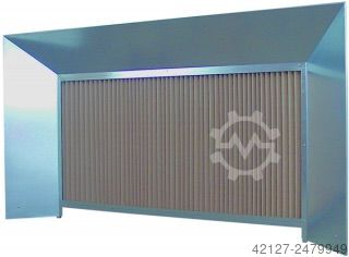 Сухой разбрызгиватель из оцинкованной листовой стали со сварной рамой основания, картонный лабиринтный фильтр в качестве фильтра предварительной очистки и фильтр из стекловолокна в качестве фильтра последующей очистки. Экс-вентилятор с дроссельной заслонкой установлен слева.