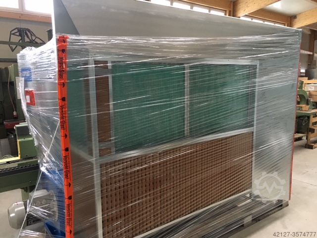 Сухие распылительные стенки из оцинкованной листовой стали со сварной рамой основания, картонный лабиринтный фильтр в качестве предварительного фильтра и фильтр из стекловолокна в качестве блока пост-фильтра. Ех-вентилятор вкл. дроссельный клапан, прикрепленный слева.