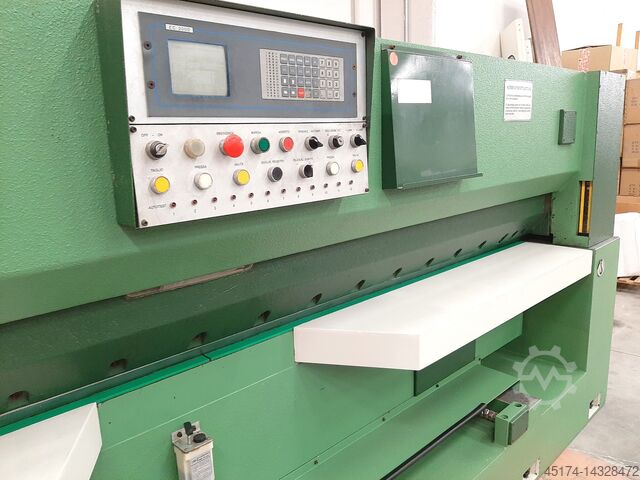 Станок позволяет за одну операцию разрезать пачку шпона с обеих сторон, подлежащих обрезке - Одновременная обрезка двух сторон пачки шпона осуществляется благодаря одновременному движению двух ножей, один из которых установлен на неподвижной конструкции, а другой - на подвижной части - Станок оснащен регулируемым задним плечом, а также прижимом для зажима пачки шпона во время операций резки.