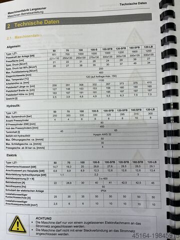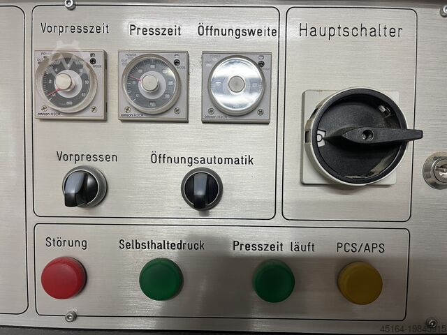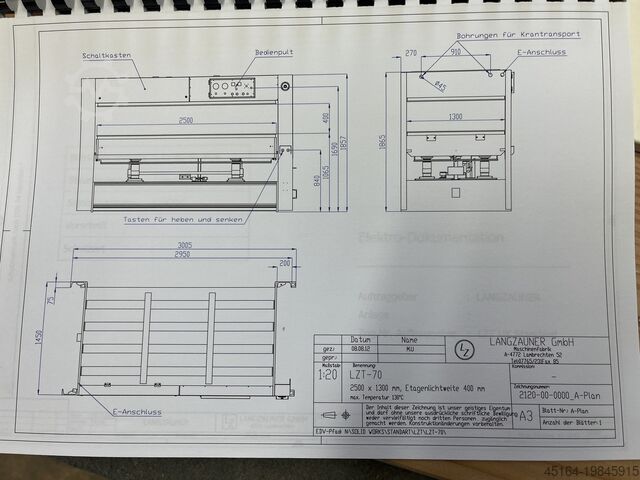 Размер пресса: 2500 x 1300 мм, свет между этажами: 400 мм, макс. температура: 130°C, удельное давление: 22 Н/см², удельное давление при 80%: 27 Н/см², макс. точечная нагрузка: 200 Н/см², рабочая высота: 1100 мм, цилиндры: 4 шт., макс. системное давление: 350 бар, общая подключенная мощность: 19,3 кВт, необходимое пространство: 2910 x 1480 x 1870 мм, масса: 3900 кг. Место хранения: поставщик.
