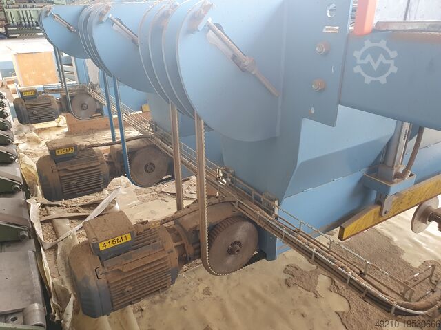 Установка для автоматической укладки сырых лущёных шпонов, например, непосредственно из сушильного агрегата / штабелер для лущёных шпонов, автоматическое устройство укладки, например, для установки/применения после сушилки шпона. Скорость: 240 м/мин. Частота: 400V 24V 50Гц. Вес: 2950кг.