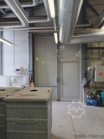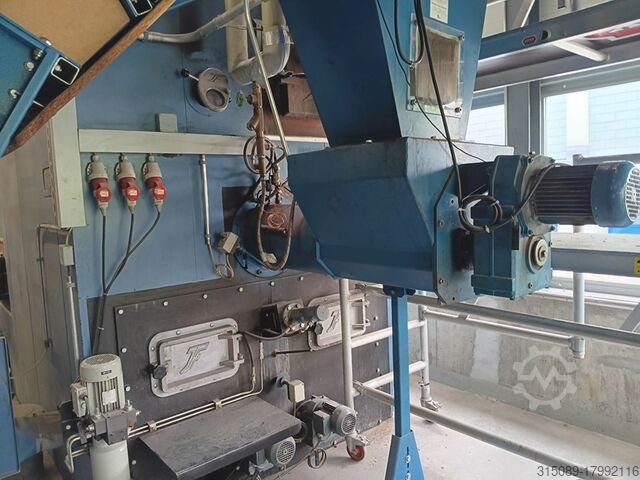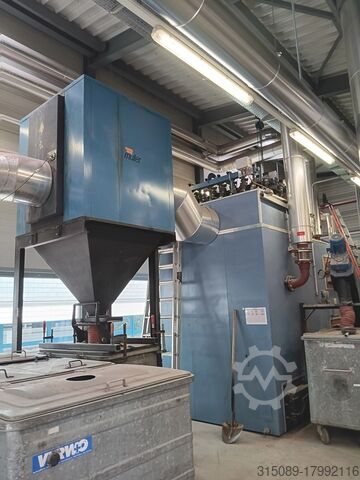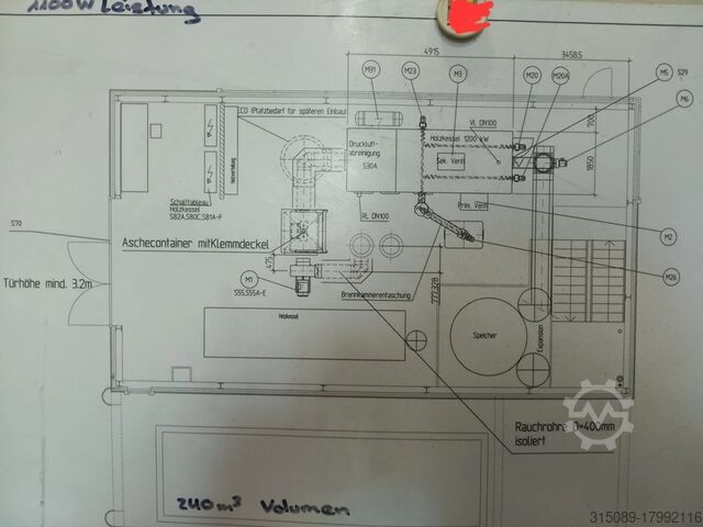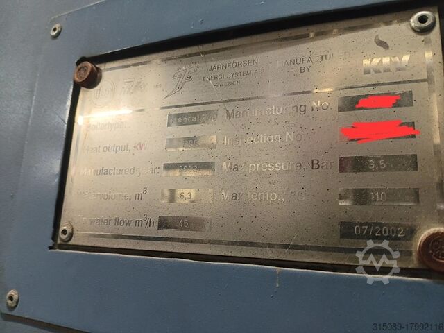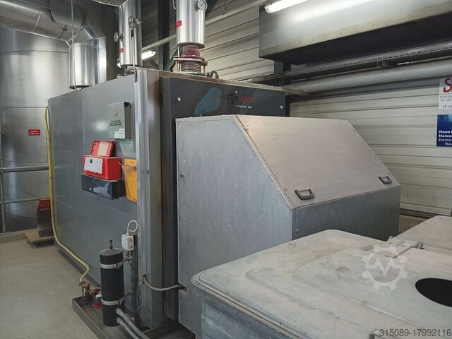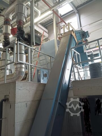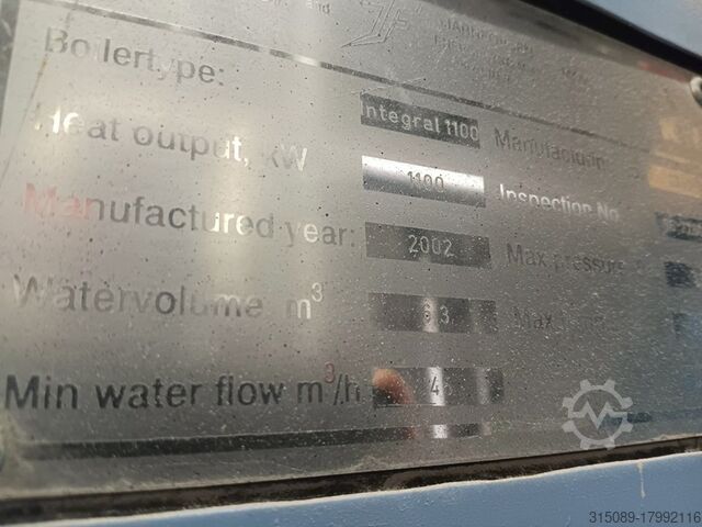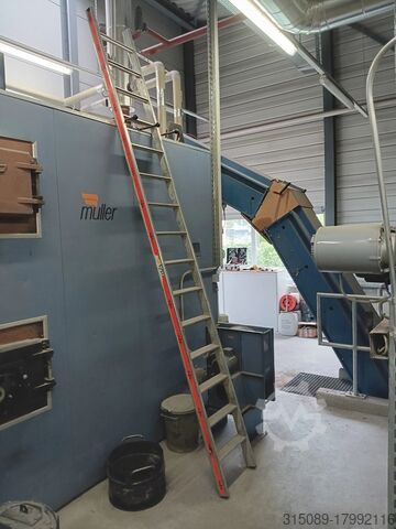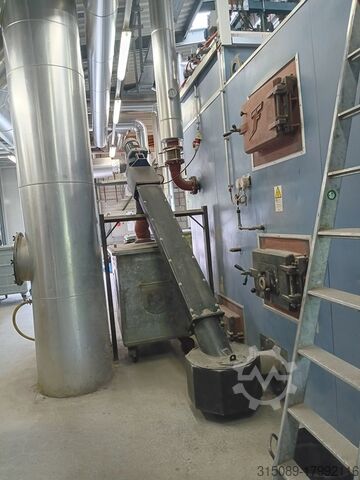 Котёл для щепы Müller, мощность 1100 кВт, система подачи топлива с движущейся колосниковой решёткой (подходит для топлива низкого качества), система горячего водоснабжения с температурой срабатывания защиты 110°C, год выпуска 2002. В комплекте: подающая шнековая система, пневматическая система очистки, автоматическая система удаления золы, пылеуловитель с дымососом, система управления, система повышения обратного потока, электрофильтр с системой управления (год выпуска 2017), толкающее днище – 4 шт. толкающих штока длиной 12 м, шириной 4,3 м, гидравлические агрегаты, цепной топливный конвейер, буферная ёмкость объёмом 23 000 литров (диаметр 1,8 м без изоляции, высота 9,3 м без изоляции), все сетевые насосы и при необходимости все отопительные трубы, масляный котёл Viessmann Vitoplex 100 с горелкой и шумозащитным кожухом, мощность 1750 кВт, год выпуска 2001, все контейнеры для золы, полная система управления, 2 комплектные дымоходные системы, полная документация по объекту, планы и прочее — всё имеется.