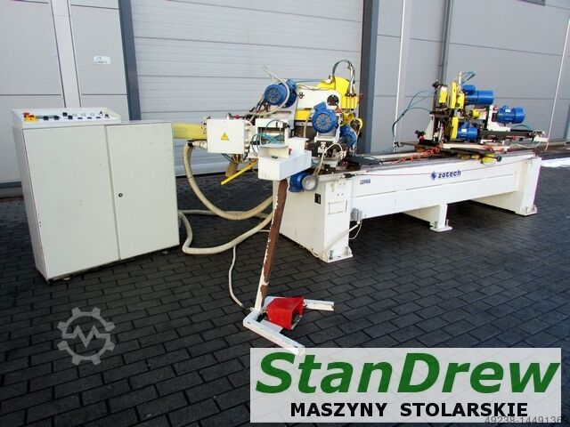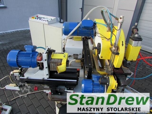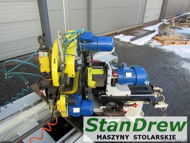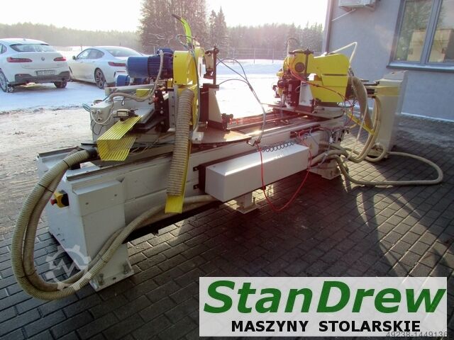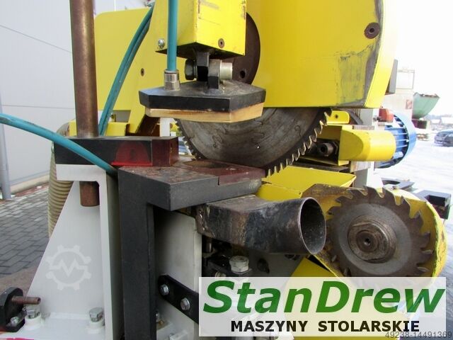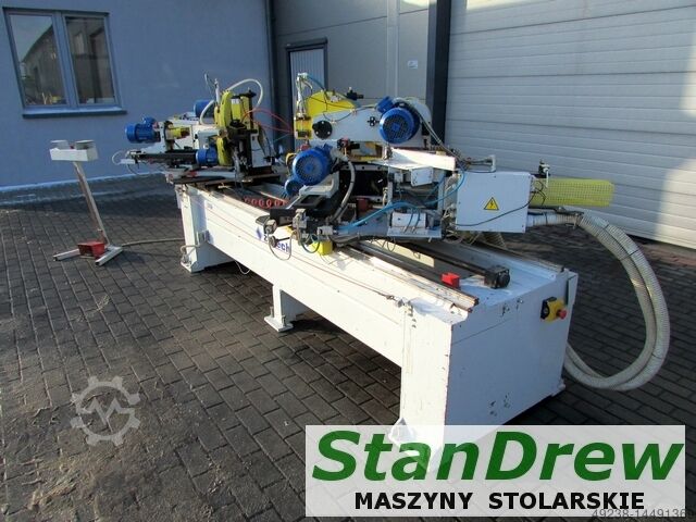 Станок оснащен двумя обрабатывающими узлами. Левый - неподвижный, а правый - подвижный. Каждый обрабатывающий узел состоит из следующих узлов - агрегатов: основной пилы, узла подрезки, узла сверления для сверления в зажатой плоскости и узла сверления для сверления в нижней части заготовки.