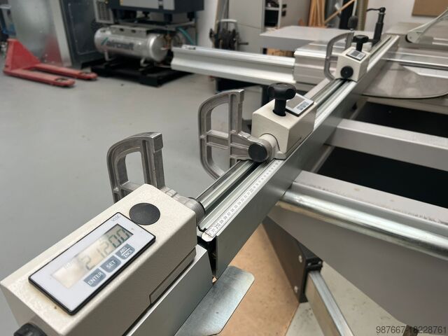 ОГРАНИЧИТЕЛЬ ШИРИНЫ С ЭЛЕКТРИЧЕСКОЙ РЕГУЛИРОВКОЙ ДЛЯ ШИРИНЫ РЕЗКИ 1250 ММ Размеры вводятся на панели управления вверху с помощью регулятора позиционирования с точностью до 0,1 мм. В парковочном положении упор можно сложить, чтобы освободить место на столе. Защитная запорная планка на случай опасности защемления между ограничителем ширины и тележкой.