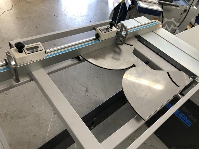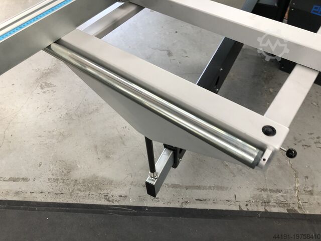 - Поперечная каретка с опорным роликом и расширением столешницы в обе стороны; упор по длине с миллиметровой шкалой, выдвижение до 3500 мм, 2 перемещаемых откидных упора и 1 концевой упор; может использоваться как двухсторонний уголковый упор (угол регулировки 0–46°), автоматическая компенсация длины и фиксация в позициях 15°, 22,5°, 30°, 45°