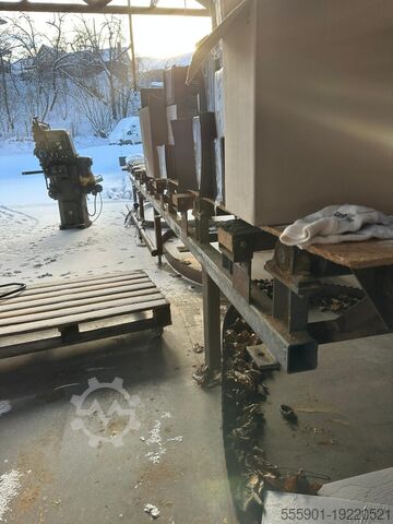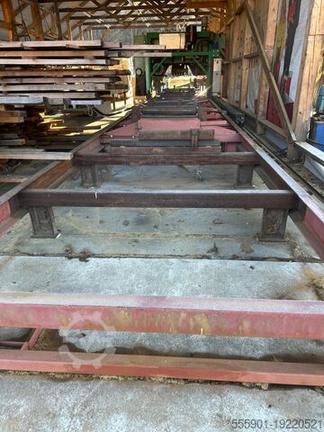 Столы за лесопилкой для приема 30 м пиломатериалов. Заточной станок, прокатный стан, 4 пилы.
