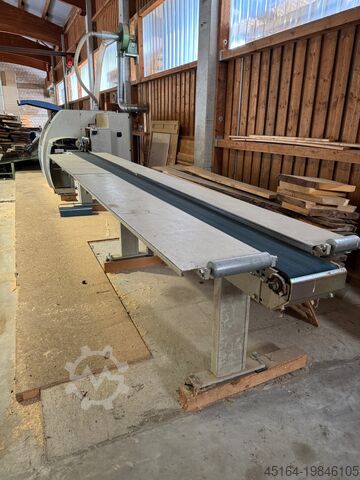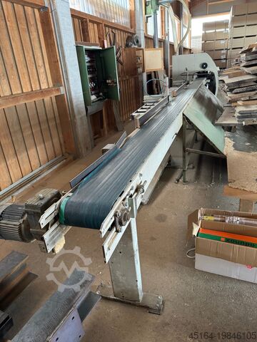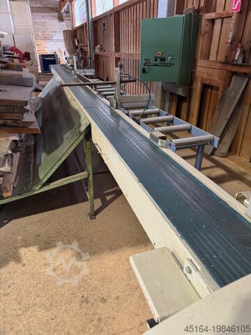 Размеры обрабатываемой древесины: Входные длины мин./макс. 500 - 6500 ммПолная оптимизация до макс. 1500 ммШирина на входе мин./макс. 40 - 300 ммВходная толщина мин/макс. 15 - 120 ммПоперечное сечение древесины макс. 300 x 40 мммакс. 200 x 120 ммФиксированная длина после распиловки мин. 510 -2800 мм Специальное применение: резка блоков, длина мин./макс. 100 - 200 мм (Внимание: несколько длин блоков на этапе сортировки, блоки транспортируются в конец сортировочной линии и попадают в сетку заказчика) Допуск на резку/раскрой +/- 0,8 - 1,5 мм (для текстуры древесины с минимальными Содержание смолы и ровная поверхность. Допуск до 1 м фиксированной длины, макс. допуск для более длинных деталей до 2,5 м). Допуск толщины +/- 3 мм Кривизна древесины во всех направлениях макс. 10 мм на метр длины Виды древесины мягкие или Твердая древесина Производительность системы: Скорость подачи, плавно регулируемая до макс. 230 м/рез - Цикл 0,6 - 1 для получения практической производительности в день, необходимо рассчитать коэффициент эффективности в зависимости от производственных условий заказчика. Высота подачи и пила 900 мм (устанавливается на платформу заказчика, пиле требуется бетонное основание) Рабочая высота сортировка 2000 мм Значения подключений: Общая электрическая мощность подключения ок. 18 кВт Рабочее напряжение 380 В / 50 Гц Колебания напряжения макс. 5 % Расход воздуха ок. 1200 н. л / рабочее давление ок. 8 бар Скорость всасывания ок. 30 м/с Цвет серый RAL 7032 и синий NCS ОБЗОР ПОЛОЖЕНИЯ 5030-R 80 B: Поз. 1 Станция подачи и маркировки с 1 боковым опорным столом, регулируемым 1 столом в качестве упорного края Поз. 2 Опорный ролик без привода, передняя сторона перед столом из листового металла для облегчения загрузки Поз. 3 Длина Измерительная станция со встроенной флуоресцентной камерой для обнаружения ошибок маркировки Поз. 4 Автоматическое измерение ширины, бесконтактное Поз. 5 Оптимизирующая торцовочная пила OptiCut 304 - правосторонняя версия со встроенным желобом для отходов, включая пакет оборудования для больших сечений древесины Графический терминал ввода (16 x 40 символов, Числовой блок) с программным пакетом для оптимизации и управления системой Доступно для обработки: - макс. 16 групп продуктов - макс. 8 качеств на группу продуктов - макс. 200 фиксированных длин на группу продуктов Поз. 6 Ленточный конвейер отвода в качестве сортировочной станции с приводным блоком Длина 7500 м Поз. 7 На ленте отводящего конвейера установлено 2 эжектора