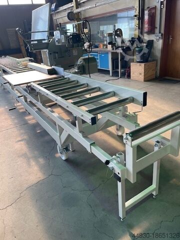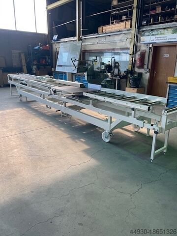 Мобильная пильная база; Общая длина около 8600 мм для пилы Graule ZS 200; Остановочный роликовый конвейер с левой стороны 5200 мм, длина измерения от 400 до 5960 мм, с цифровым светодиодным дисплеем размеров, длина измерения, включая удлинение, около 8800 мм,