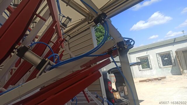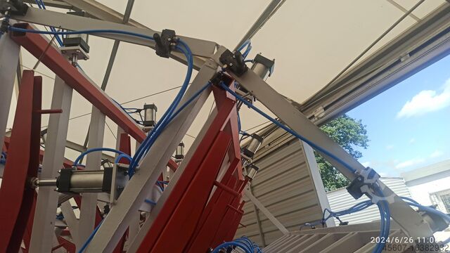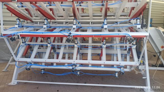 Пресс для склеивания древесины 12 рабочих полей основные цилиндры 12 x 3 =36 штук , цилиндры 63 x 60 и 4 боковых выравнивания давления 50 x 50 штук 12 x 4 =48 штук .Станок новый накладная .Гарантия один год .Пресс вращается с инверторным управлением трансмиссии .Остановка пресса на индукционном датчике .Или вращается плавно .Привод цилиндров с рычажными переключателями поля пресса шириной один метр 2,6 длина 60 мм толщина .
