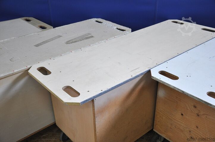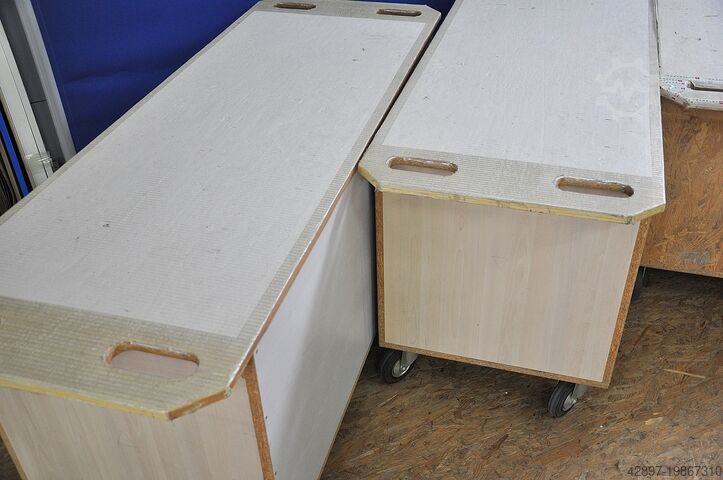 Частично покрыты картоном для защиты мебельных деталей. Тележки собраны из плитных материалов с помощью винтов. Верхняя плита из КС-панели с кромкой из ABS и ручными отверстиями.