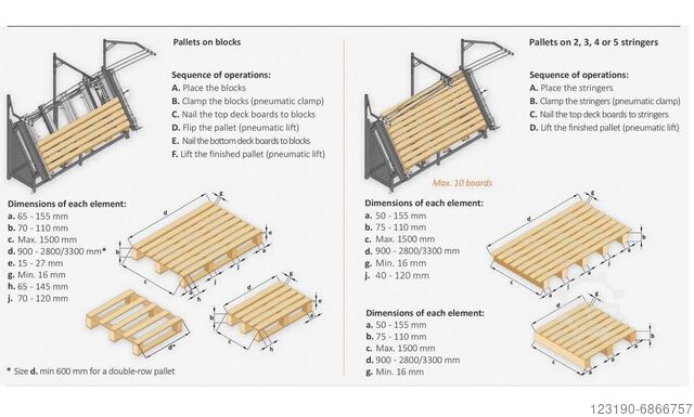 Pneumatico PT-3300 - это регулируемый, полуавтоматический стол для производства поддонов различных размеров. Его эргономичная конструкция позволяет быстро и легко регулировать размеры поддона по ширине в пределах 900-3300 мм и длине до 1500 мм. Для управления машиной достаточно одного оператора, способного производить 170-200 поддонов в течение 8 рабочих часов (в зависимости от навыков оператора и организации труда).