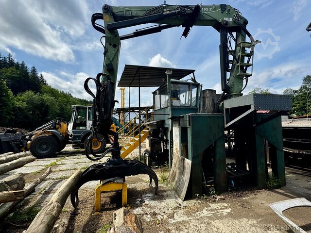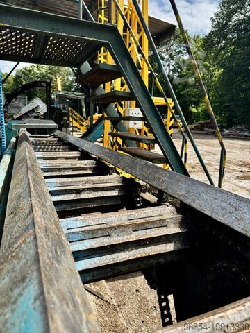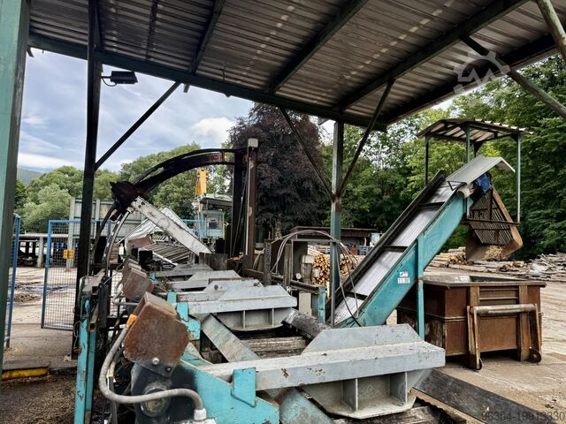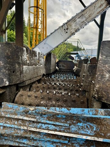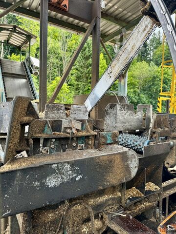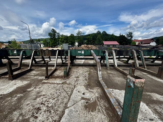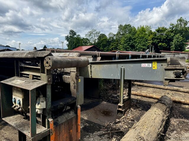 Установка для обработки и сортировки бревен с 2D измерительной системой KESAT, цепной пилой и погрузчиком LogLift F 165 Z. Подающие цепные конвейеры, роликовые конвейеры вокруг цепной пилы, сортировочный цепной конвейер. Гидравлически приводимые толкатели и ограничители длины. Примерные размеры 20 x 70 м.