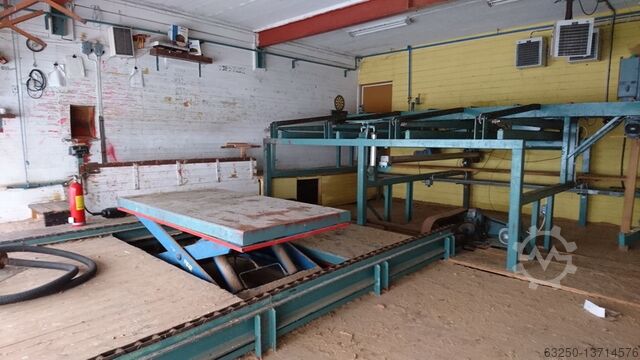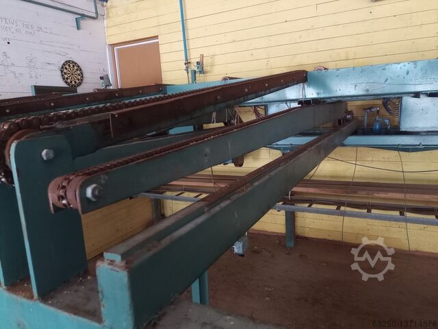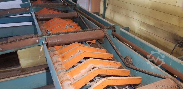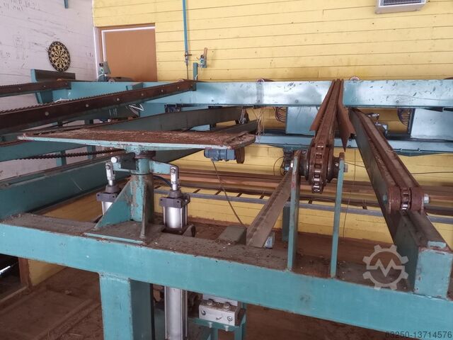 Линия для повторной укладки, обрезки и поперечной распиловки досок и брусьев по длине.