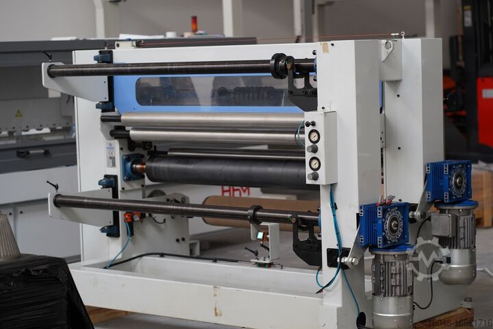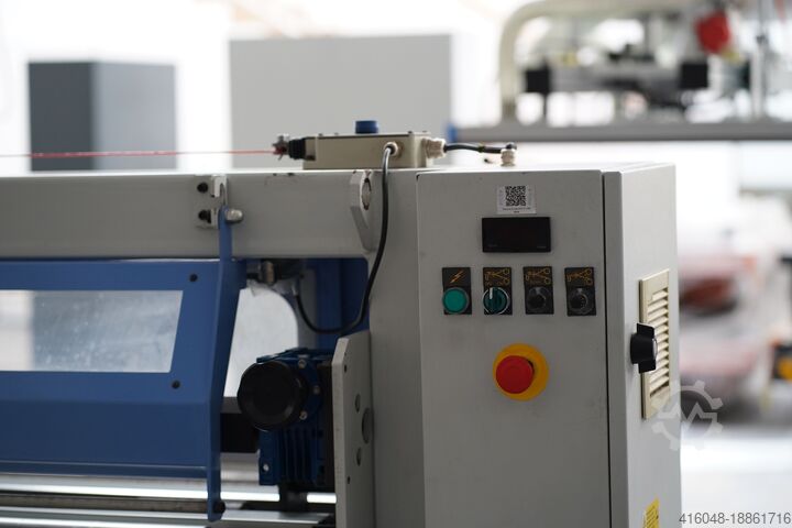 Резка осуществляется дисковыми ножами с пневматическим давлением, а перемотанный материал подается на намоточные валы.
