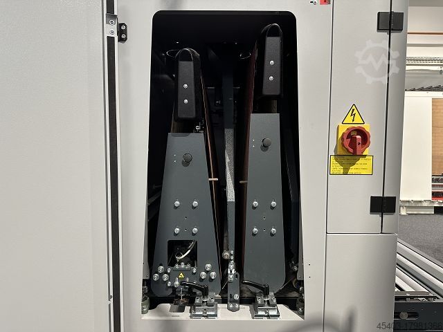 2-й блок (блок шлифовальных дисков). Электропневматическая сегментированная шлифовальная плита с шириной сегмента 25 мм позволяет обрабатывать несколько заготовок независимо друг от друга для идеального шлифования шпона. Вентилятор очистки с регулировкой времени, входящий в стандартную комплектацию, гарантирует максимальный срок службы шлифовальной ленты, особенно при шлифовании лака.