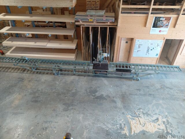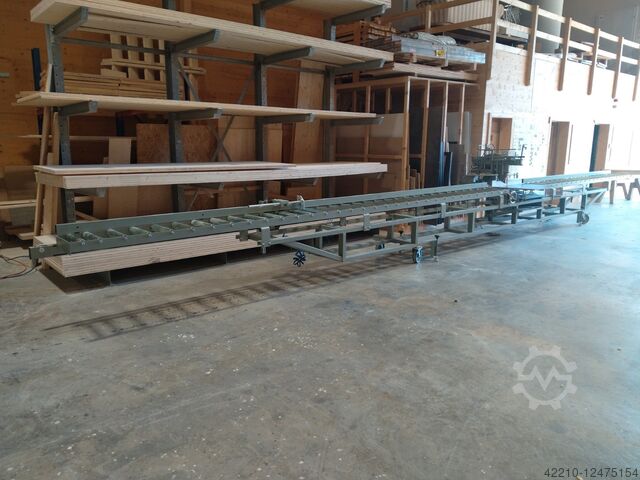 1 сверхпрочный режущий роликовый конвейер, длина 6000 мм, сторона крепления левая. Упор регулируется спереди с помощью маховика. Длину можно измерить в цифровом виде с точностью до миллиметра. Упор фиксируется пневматически.