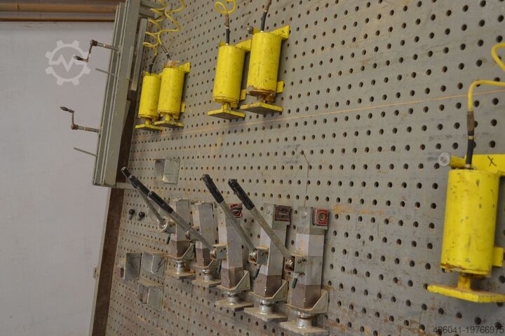 Перфорированная плита из стального листа толщиной 10 мм с шагом отверстий 50 мм. Гидроцилиндры и комплектующие, показанные на фото, не все исправны и требуют обслуживания. Подробности по запросу.