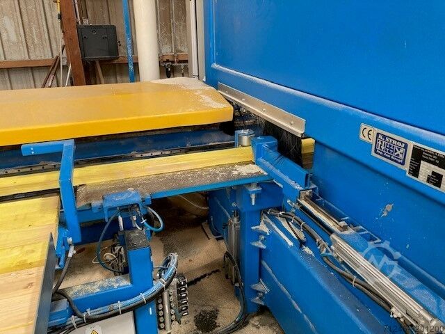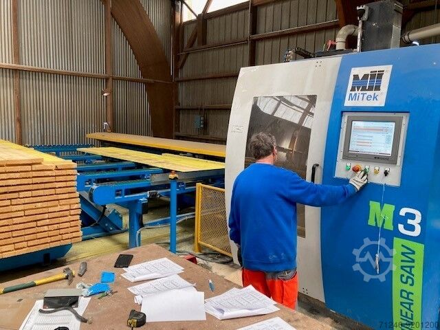 - Автоматический режим работы: на основе файла с информацией об участке, станок автоматически оптимизирует распилы и указывает оператору порядок подачи пиломатериалов на распил. Оператор раскладывает пиломатериалы на подающем столе в заданном порядке, станок распиливает их, а оператор забирает распиленные брусья с подающего стола.