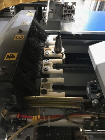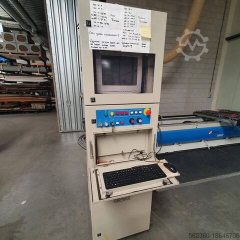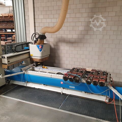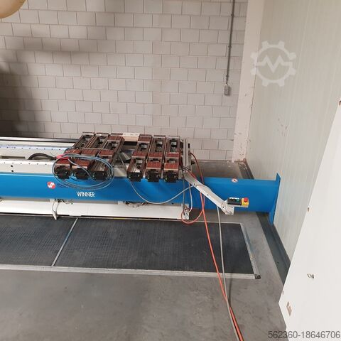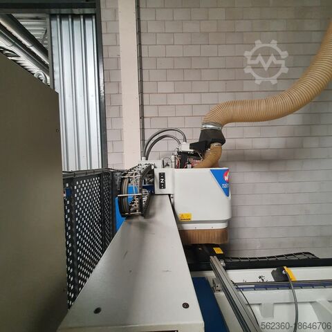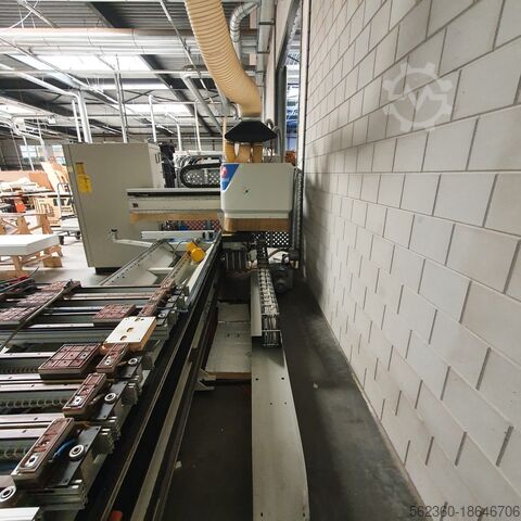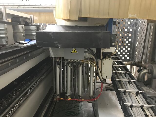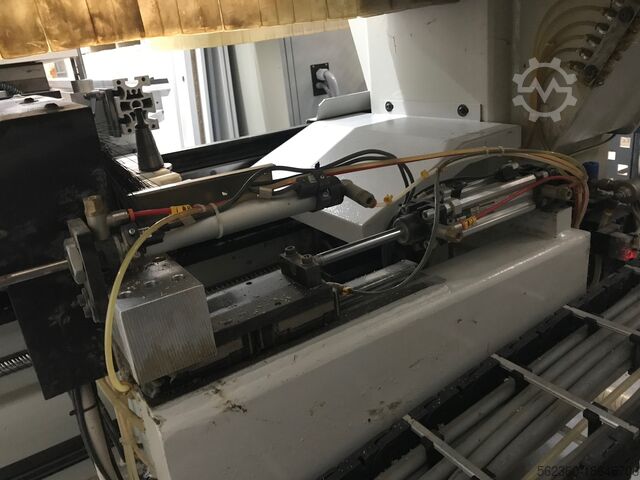 Год выпуска 2000, ось x = 3200 мм, ось y = 1250 мм, ось z = 150 мм, фрезерный шпиндель 8 кВт, 24 000 об/мин, ISO 30, сверлильная головка = вертикальные сверла оси x – 8 шт., вертикальные сверла оси y – 3 шт., двойные горизонтальные сверла оси x – 2 шт., двойные горизонтальные сверла оси y – 1 шт., вакуум 100 м3/ч. Остальные в прилагаемой документации.
