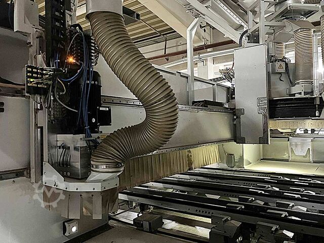 Предлагается ЧПУ многошпиндельный центр по обработке древесины Reichenbacher с автоматическим суппортным столом и вакуумными пинами. Перемещения по осям X1/X2: 8540 мм, Y1: 2500 мм, Z1: 480 мм, поворот оси B: 180°, поворот оси C: 360°, ось X3: нижняя сверлильная головка, U2-U10: перемещение суппортов 1-9 (портал), скорость осей X/Y/Z: 60/60/20 м/мин, скорость поворота B/C: 90°/с, размеры стола X/Y: ок. 8500/2600 мм, макс. вес заготовки: 150 кг, макс. размеры заготовки X/Y: 8500/2600 мм, количество суппортов: 9, присосок на суппорт: 8, диаметр присоски: 100 мм, позиционирование суппортов: +/-1000 мм, мин. расстояние между суппортами: 300 мм, общее количество вакуумных пинов: 72, ход вакуумного пина: 100 мм, рабочий ход пина: 25 мм, позиции для инструмента: 24, макс. вес инструмента: 6 кг, макс. длина инструмента: 240 мм, макс. диаметр инструмента: 300 мм. Общие габариты установки X/Y: ок. 15000/8000 мм, вес: ок. 20000 кг. Документация имеется. Возможен осмотр на месте. Ожидаемая доступность — с конца сентября 2025.