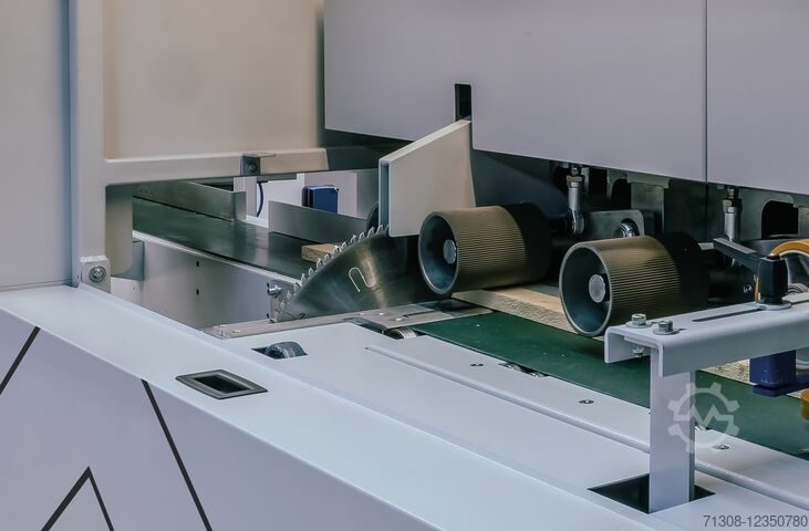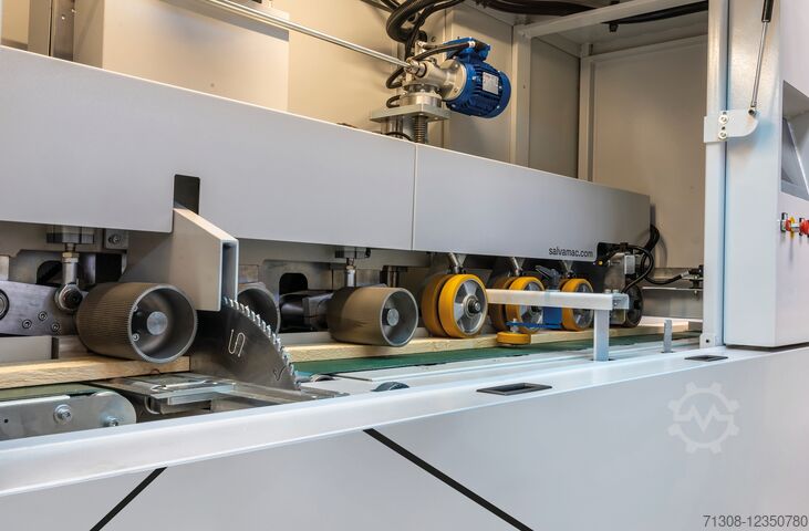 Инновационная высокоскоростная оптимизирующая пила с оптимизацией и устранением дефектов древесины, с двойным приводом с верхними роликами и нижней подающей лентой с независимым управлением.