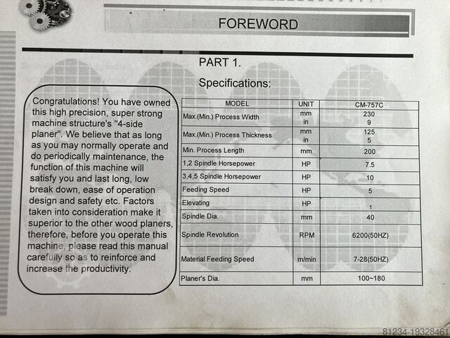 Вы приобрели этот высокоточный, сверхпрочный станок с "4-сторонним строгальным станком". Мы считаем, что пока вы можете нормально эксплуатировать и проводить периодическое техническое обслуживание, функция этого станка будет вас удовлетворять и служить долго, низкий уровень поломок, простота эксплуатации и безопасность и т. д. Принятые во внимание факторы делают его превосходным по сравнению с другими строгальными станками по дереву, поэтому, прежде чем приступить к эксплуатации этого станка, внимательно прочтите это руководство, чтобы укрепить и повысить производительность.