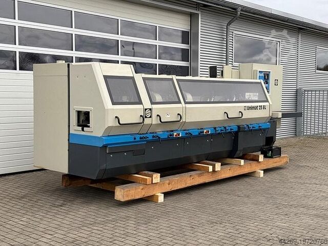 Строгально-калевочный станок Weinig Unimat 23EL для четырехстороннего строгания и профилирования древесины с подвижным шпинделем для автоматической регулировки и пазовой станиной для коротких и криволинейных заготовок, а также длинным фуговальным столом.