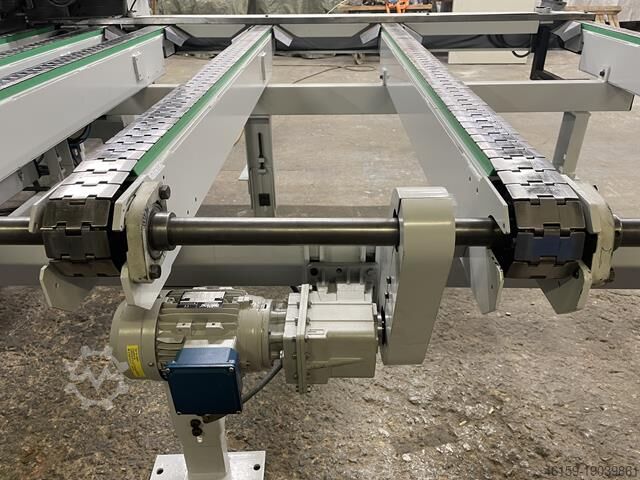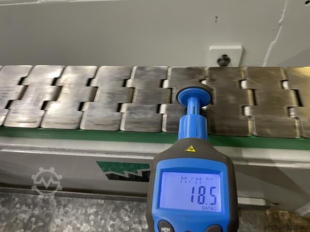 Буфер исходного сырья выравнивается и укладывается плоской стороной друг к другу на цепной поперечный питатель. Цепной питатель транспортирует детали к ограждению. Деталь, находящаяся рядом с ограждением, обнаруживается световым лучом, и первый ролик поднимается, чтобы обеспечить вход, а затем транспортировочный ролик проталкивает деталь под подающие ролики строгального станка. Первый подающий ролик рубанка должен быть свободно вращающимся, чтобы обеспечить работу EM814.