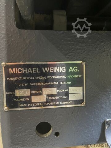 Количество шпинделей: 5 шт.\nРабочая ширина: 230 мм\nВысота строгания: 120 мм\nМощность привода подачи: 2,2 кВт\nСкорость подачи: 5–24 м/мин.\nОбщая установленная мощность: 25 кВт\nГабариты (Д x Ш x В): 3400 x 1800 x 1610 мм\nМасса станка: около 2500 кг\nЧетырёхсторонний строгальный станок WEINIG PROFIMAT 23 E\n\n- Год выпуска: 1997\n- Серийный номер: 226-60758\n- Максимальная рабочая ширина: 230 мм\n- Максимальная рабочая высота: 120 мм\n- Карданная бесступенчатая подача: 5–24 м/мин.\n- Мотор подачи: 2,2 кВт\n- 1-й шпиндель снизу: 4,0 кВт\n- 2-й шпиндель справа – мотор для 2-го правого и 3-го левого шпинделя: 7,5 кВт\n- 3-й шпиндель слева\n- 4-й шпиндель сверху, мотор 5,5 кВт\n- 5-й шпиндель снизу, мотор 4,0 кВт\n- Электрическая регулировка по высоте, 0,25 кВт\n- Все шпиндели оснащены тормозными моторами\n- Частота вращения шпинделей: 6000 об/мин\n- Диаметр шпинделя: ø 40 мм\n- Стол рейсмуса 2000 мм с зубчатыми вставками и направляющей\n- Прижимные ролики подачи с пневматическим прижимом\n- Подающие ролики, Ø 140 мм\n- Транспортировочные ролики напротив левого шпинделя\n- Входной ролик перед рейсмусом с пневматическим управлением\n- Счётчики SICO\n- Ручной насос для смазки воском\n- Центральные точки смазки\n- 1 комплект – строгальные головки\n- Общая мощность подключения: 25 кВт\n- Габариты станка: Д = 3400 мм, Ш = 1800 мм, В = 1610 мм\n- Масса: 2500 кг