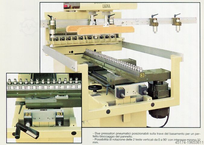 1 вертикальный сверлильный узел с двумя поперечными головками, каждая с 21 регулируемым шпинделем, которые также можно позиционировать в продольном направлении