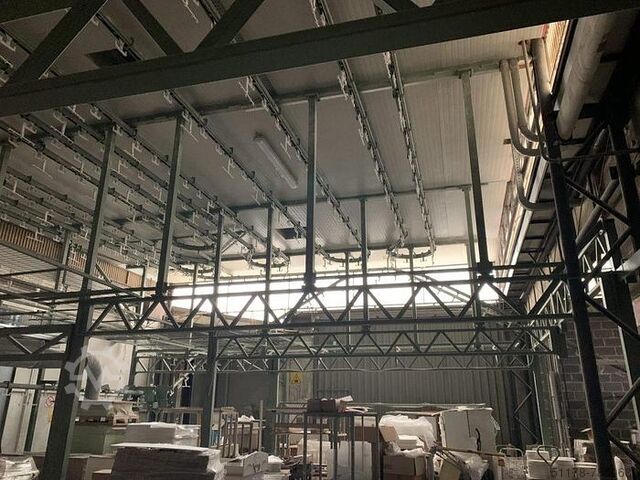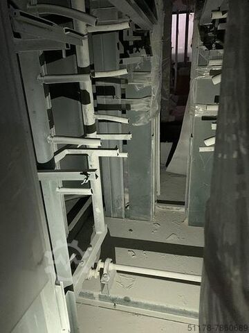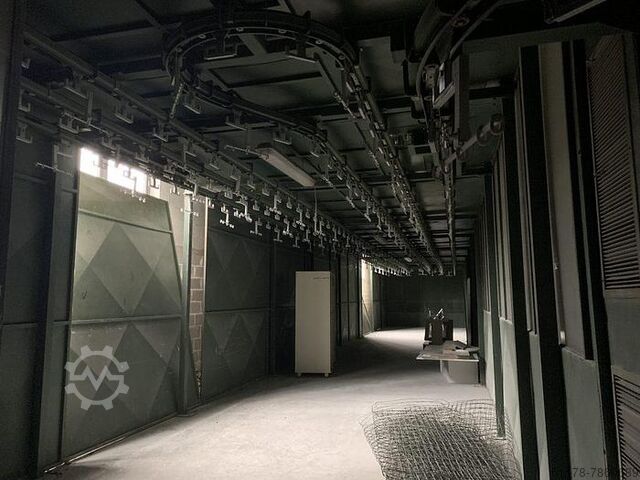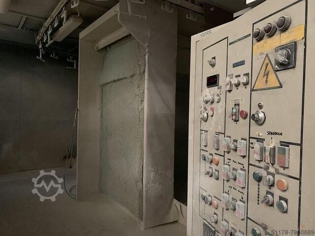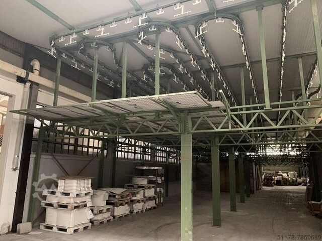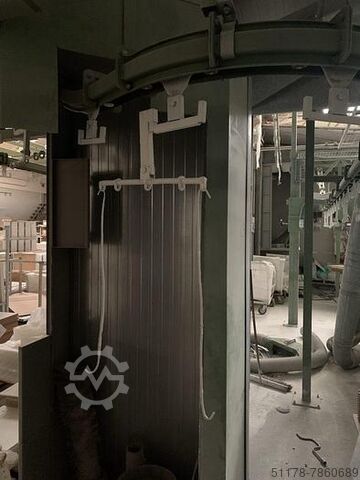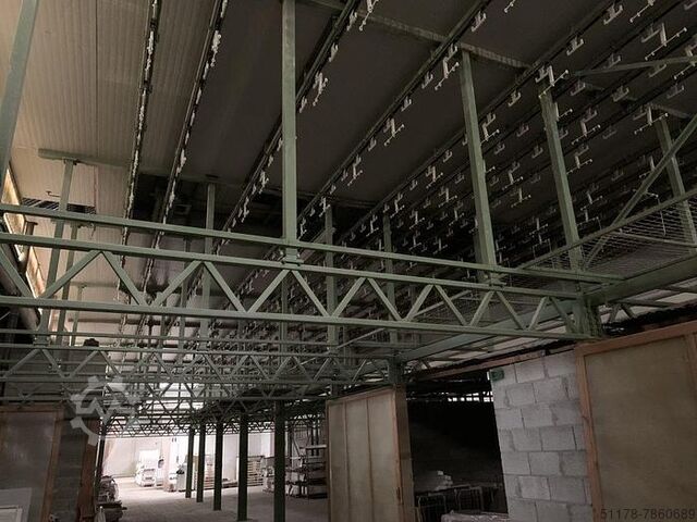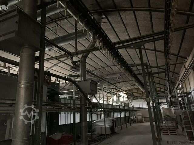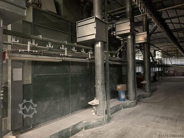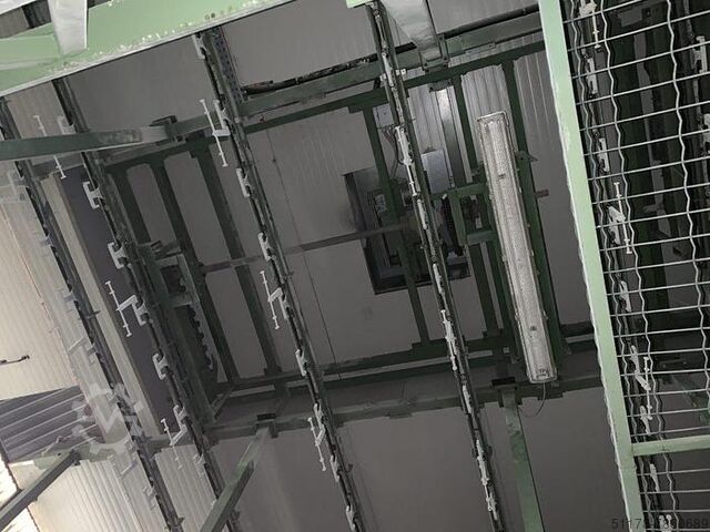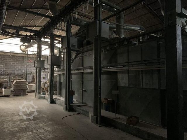 Система водной покраски в комплекте с цепью длиной 865 погонных метров с очистителями, дорожками, опорами, покрасочными камерами, поршневыми насосами Sames с вращающимися чашами, генераторами, покрасочными насосами, воздуходувками, сушильными туннелями, таблицами и принадлежностями