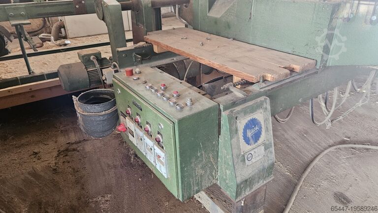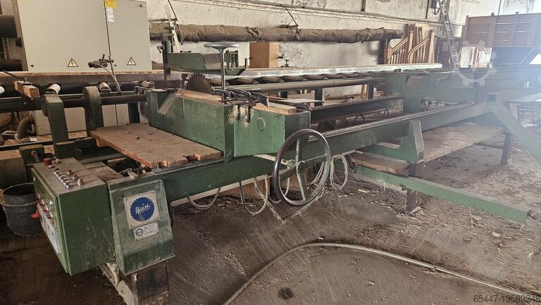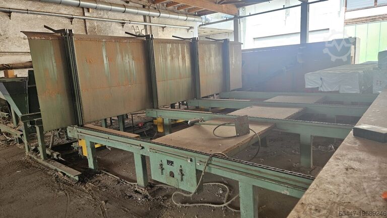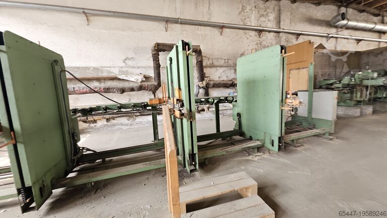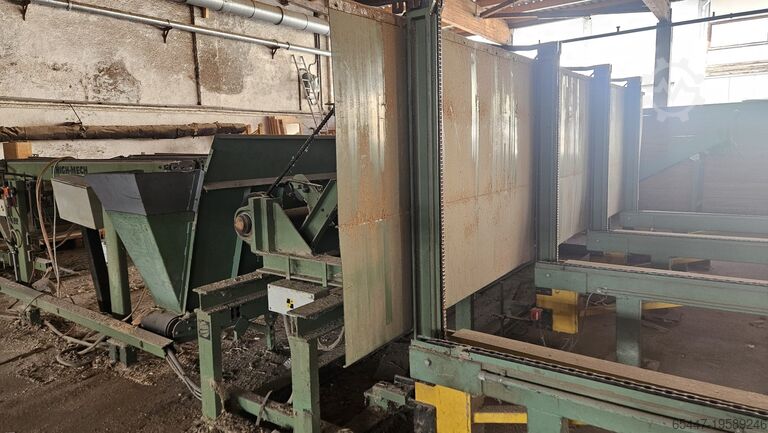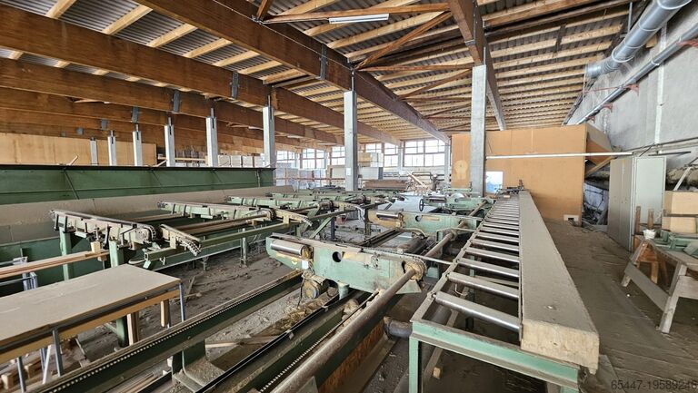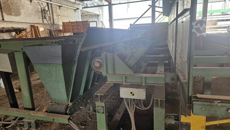 Полная линия для форматирования доски, состоящая из роликовых конвейеров, устройства для разукладки, транспортного стола, пилы Haist, четырехстороннего строгального станка Weinig Hydromat 22 AL с оснасткой и штабелера.