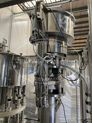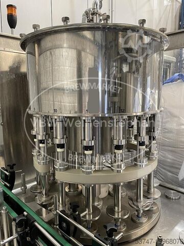 Гравиметрический наполнитель стеклянных бутылок с короткой трубкой с 16 наливными клапанами и укупорочным устройством для кроненпробки. Управление осуществляется через ПЛК Eaton.