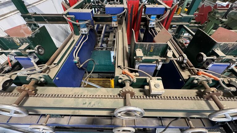 В состав линии входят: - горка для досок, - роликовый конвейер, подающий доски в один конец, - поперечный конвейер с функцией разделения, - упаковщик досок, - кассеты для подкладки, - подъемник пакетов досок, - цепи выходного конвейера.
