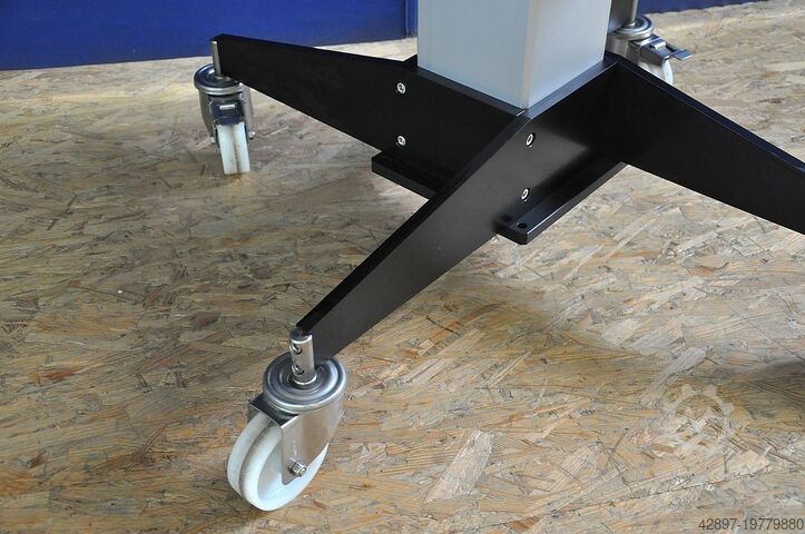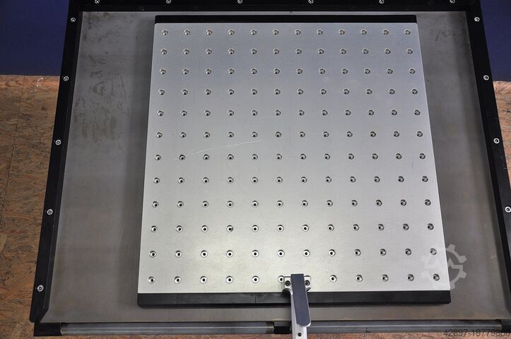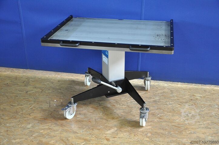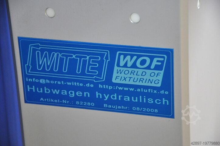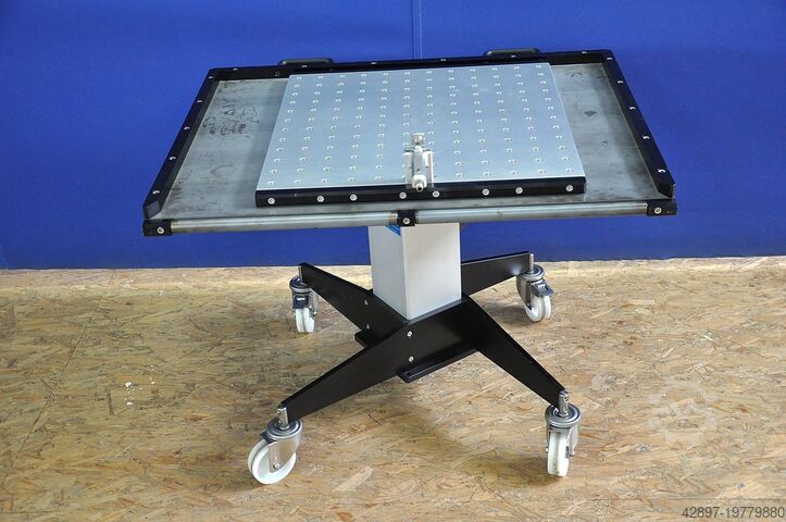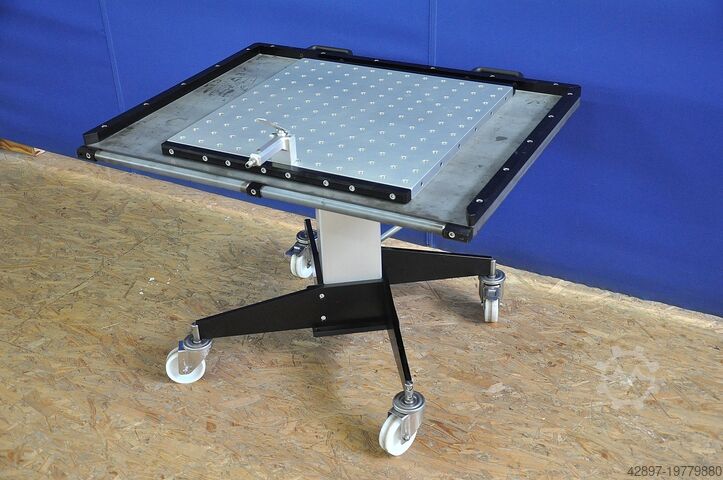 Гидравлически регулируемая по высоте тележка Witte - Alufix для подачи на координатно-измерительные машины\nС воздушной опорной пластиной Hovercraft\n\nТележка с гидравлической регулировкой высоты в диапазоне примерно от 660 до 950 мм. Поверхность стола покрыта, с роликом на широкой стороне для компенсации разницы по высоте между столом и измерительной плитой. Внутренний размер приблизительно 900 x 700 мм.\n\nПлита с воздушной подушкой Eurofix с ручкой и интегрированным воздушным клапаном для легкого перемещения и позиционирования тяжёлых заготовок на координатно-измерительных машинах. Поверхность оснащена отверстиями с сеткой 50 мм. Отверстия имеют диаметр 12,5 мм, глубину 7 мм и вставки с резьбой М6 на дне.\n\nБлагодаря встроенному в ручку клапану воздух подаётся в пластину, что позволяет легко перемещать всю плиту с установленным на ней объектом измерения. Рабочая поверхность (алюминий) составляет примерно 600 x 600 мм. Идеально подходит для зажимных систем Witte Alufix для оснастки в автомобилестроении и других областях.\n\nГабариты прибл. 1000 x 800 x 660/950 мм (ДxШxВ), вес ок. 100 кг.\n\nМашину можно посмотреть у нас на складе по предварительной договорённости. Мы предлагаем только то оборудование, которое готово к демонстрации непосредственно у нас на складе; смотрите также другие предложения этого поставщика.