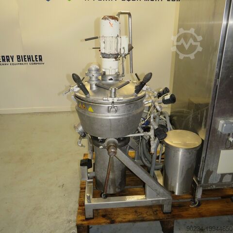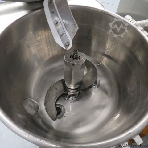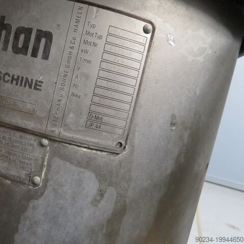 Б/у куттер из нержавеющей стали STEPHAN, модель UMM/SK40E PILOTE № 4418598. Вместимость 40 литров. Наклоняемый сосуд из нержавеющей стали с двойной рубашкой. Приводится в действие двигателем 10 л.с. - 1500/3000 об/мин - 380 В. - Электрическая панель управления - скребок с отдельным двигателем.