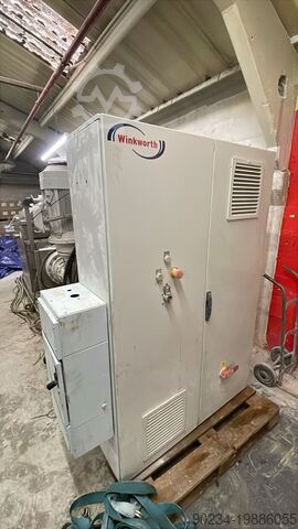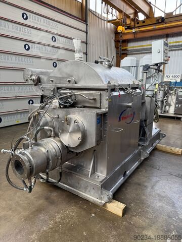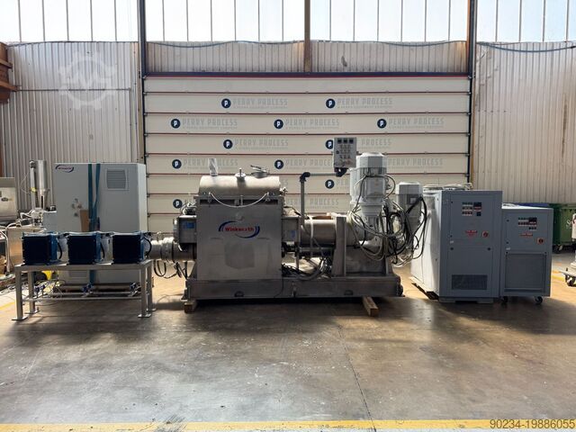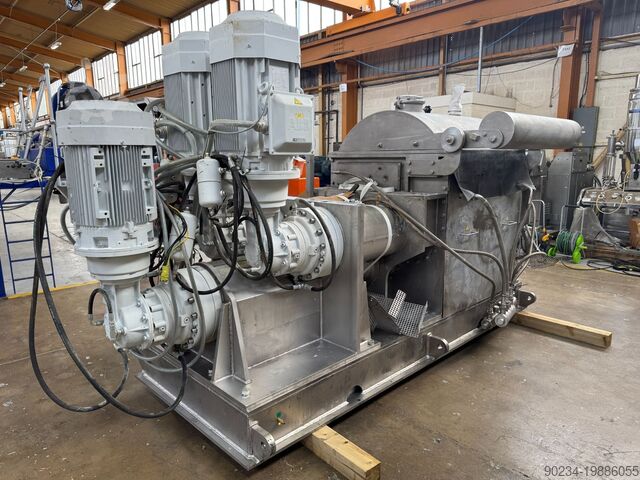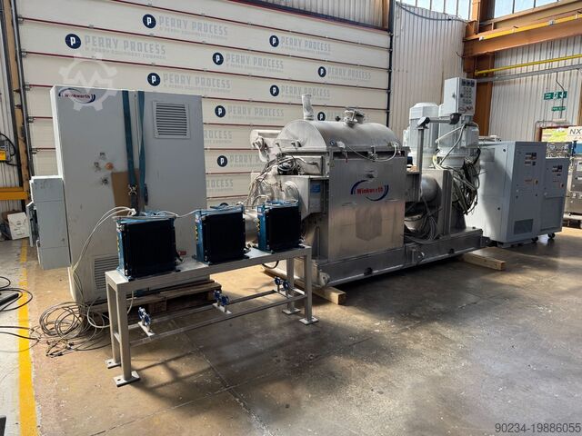 Используемый Z-образный смеситель/экструдер Winkworth модели ZX500-6 из нержавеющей стали с рубашкой. Ориентировочная рабочая ёмкость – 500 литров, общая ёмкость – 778 литров (зависит от продукта). Камера из нержавеющей стали 304 размерами примерно 1 090 мм длина x 956 мм ширина x 735 мм глубина. Устройство оснащено куполообразной вакуумной крышкой. Внешняя рубашка также из нержавейки 304. Каждый Z-образный мешающий орган приводится в движение мотор-редуктором мощностью 30 кВт. Винтовой разгрузочный шнек из нержавейки с мотор-редуктором 22 кВт. В комплект входит панель управления. Также в комплекте: (1) б/у установка нагрева/охлаждения Tool Temp модели TT-14500 H и (1) б/у Tool Temp TT-508 X. Включает (3) масляных охладителя HYDAC, установленных на общей раме. Имеет основной пульт управления и локальные органы управления оператором.