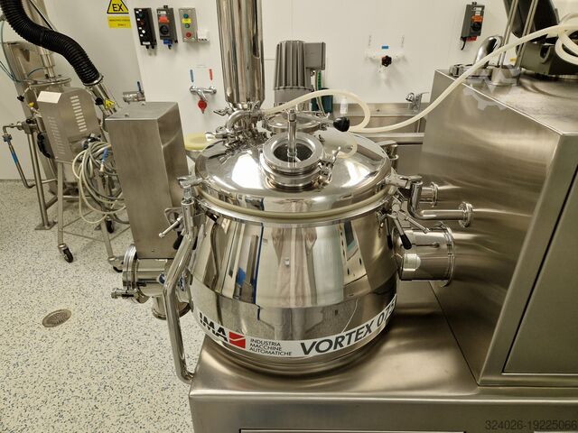 Б/у 75-литровый смеситель-гранулятор IMA Model VORTEX 075 из нержавеющей стали. Общая емкость чаши 75 литров, рабочая емкость примерно 20 - 50 литров. Имеет закрытую чашу. Основное рабочее колесо приводится в действие двигателем мощностью 3,0 кВт. Измельчающий нож приводится в действие двигателем мощностью около 1,5 кВт. Крышка чаши открывается с помощью пневматического цилиндра. Также имеет верхний пылевой фильтр из нержавеющей стали. Боковое выпускное отверстие с пневматическим клапаном. Включает локальные панели управления и главный распределительный щит.