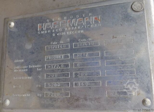 Объем контейнера 5200 литров Вакуум 1,0 бар Макс. избыточное давление 2,6 бар Макс. допустимая рабочая температура 200 °C Конструкция подвесная Стоячая конструкция Когти