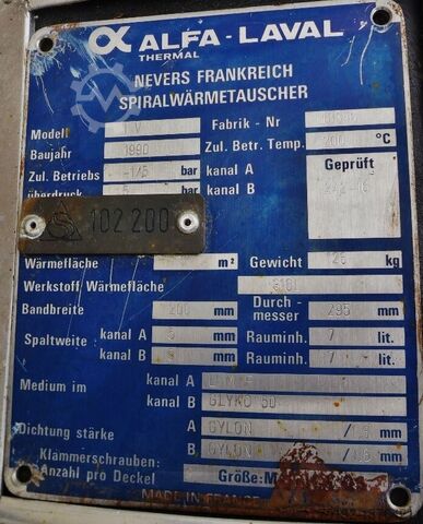 Общие сведения Производитель ALFA-LAVAL Расположение Бремен Состояние б/у Другое Допустимая рабочая температура: 200° CCКанал A:Объем: 7 литровДопустимое рабочее давление: -1/+5 барШирина зазора: 5 ммСредство: LMFCКанал B:Объем: 7 литровДопустимое рабочее давление: 5 барШирина зазора: 5 ммСредство: Glyko 50Материал поверхности нагрева: 1.4404 (V4A)Соединения частично отрезаны (см. фотографии)