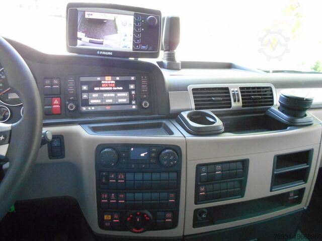 Engine: D1556LF09, front axle with leaf suspension, rear axles with air suspension, steered and liftable trailing axle, differential lock, hill start assist, lane departure warning system (LGS IV), disc brakes, MAN BrakeMatic, emergency brake signal (ESS), Emergency Brake Assist (EBA2), ABS, ASR, ESP, engine brake, tyres: front and drive axles 315/70R22.5, rear axle 385/55R22.5, cab with 2 seats, air-suspended driver comfort seat with heating, 1 static passenger seat (not a 3-seater, crew configuration 1+1 only), central locking, cruise control, automatic climate control, fine dust and pollen filter, Eberspächer D4S auxiliary heater, speed limiter, immobiliser, multifunction steering wheel, entry lights on both sides, TollCollect pre-installation, digital tachograph MAN, MAN Tronic onboard computer, MAN Media Truck radio with navigation preparation, hands-free system, tinted windscreen, door and side windows, electric windows, electrically adjustable and heated mirrors, smoker package, rotating beacon, sunblind.